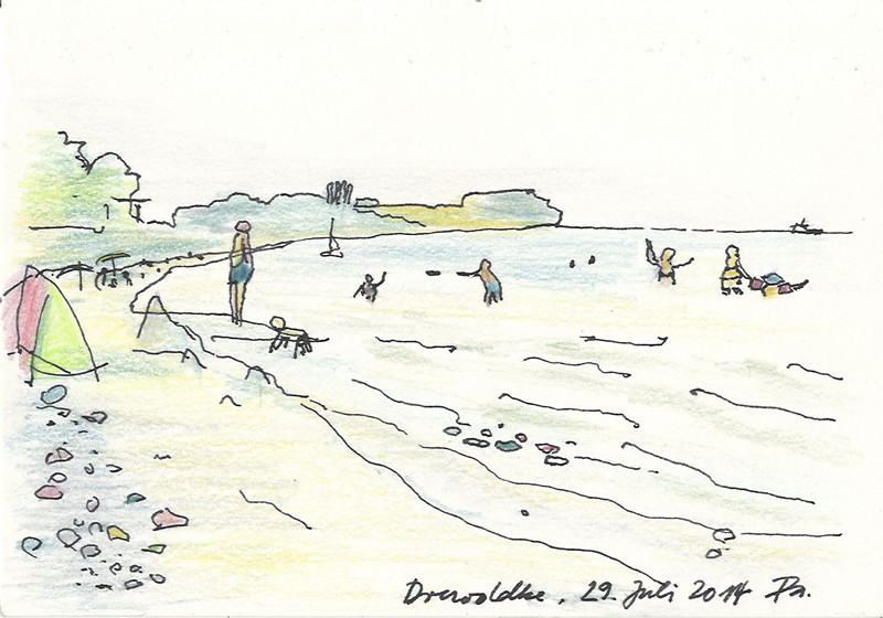 Wir sind im Entspannungsmodus auf Rügen, an der Tromper Wiek. Mir kribbelt es in den Fingern, endlich wieder zeichnen, die Farben der Landschft verstehen. Ich habe mich auf dem steinigen Strand niedergelassen, der Strand zeigt sich heute von seiner familienfreundlichen Seite, nur kleine Wellen kräuseln die Wasseroberfläche.