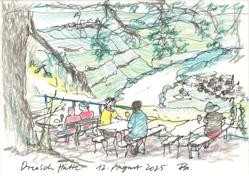 Verschwitzt vom Aufstieg durch die Steilen Weinberge bei Bullay entlang der Moselbahn kommen wir auf einer kleinen Lichtung am Prinzenkopf an und staunen nicht schlecht. Hier steht wie aus dem nichts ein Weinausschank. Bei feinem Moselwein und schönstem Blick in Tal genießen wir die Erfrischung.